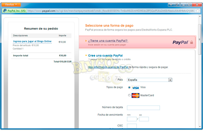 PayPal es una forma rápida, fácil y segura de ingresar dinero en un bingo de Internet sin tener que compartir con el bingo datos bancarios. Se trata de abrir una cuenta en el sitio web Paypal que podremos utilizar para realizar pagos online y recibir ingresos.